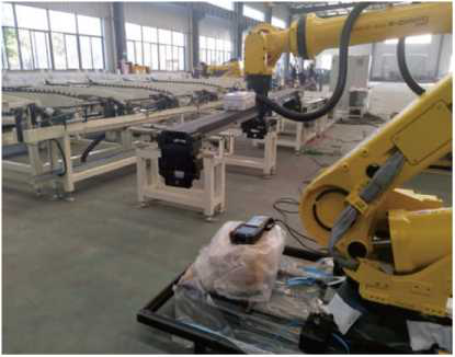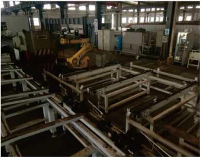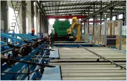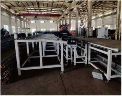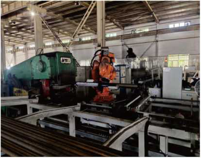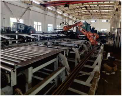 | 链条输送机将棒料输送到机器人生产放料框内 |