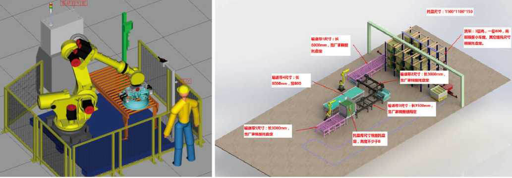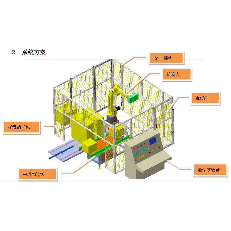 我公司已为多所高职院校设计、制造多套机器人系统,用于码垛、焊接、打磨等机器人应用种类的演示及教学。圏中所示为码垛机器人教学系统布局,由机器人、来料物流线、托盘输送线、围栏及电气系统构成。系统中以纸箱模拟实际生产中的产品,产品通过来料物流线源源不断的输送至机器人工作站内,系统検测到有产品进入搬运区域,机器人自动运行,将产品码放在托盘上。机器人内部装有码垛软件,自动计算每个摆放的层数及位置,托盘摆满后,托盘输送线将托盘推出机器人系统,等待。该系统可能的模拟实际生产时,设备运行的方式及可能出现的状况,对学生掌握机器人的操作及了解实际工厂的生产流程有大的帮助。另外,根据具体要求,系统还可以增加视频监控,工件种类扫码分类等功能。